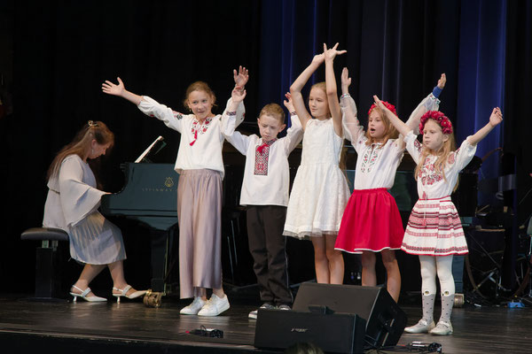 Aus dem Gesangsbereich wurde das Publikum mit unterschiedlichen Beiträgen überrascht: mit ukrainischen und deutschen Liedern des Ukrainisch-Europäischen Schulchors der Grundschule Pullach, mit dem berühmten „Das Kinderspiel“ von W.A. Mozart, spielend leicht vorgetragen von Philipp Kaiser und mit dem bekannten Song „Love in the dark“ von Adele, mit beeindruckender Stimme von Jinda Osman gesungen.